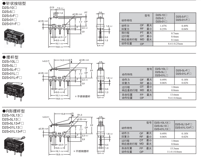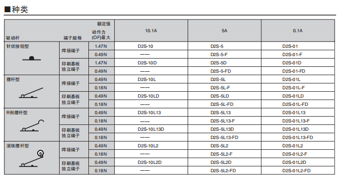 具有較好的耐焊劑性的超小型系列 焊劑無法進(jìn)入的一體成型端子結(jié)構(gòu)。 動(dòng)作位置(OP)的精度高達(dá)±0.25mm,周邊設(shè)計(jì)和定位簡(jiǎn)單。 采用了橫向操作中也能方便動(dòng)作的針狀按鈕型。